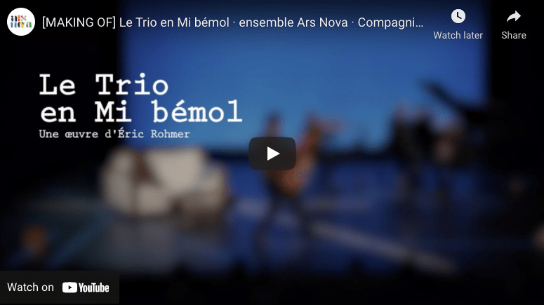 Plongez dans les coulisses du « Trio en Mi bémol », unique pièce de théâtre écrite par Eric Rohmer, à travers les regards croisés de Véronique Lesergent (metteure en scène et scénographe), Élisabeth de Sauverzac (costumière), Eléonore Dupraz (comédienne), Ugo Broussot (comédien), Alain Trésallet (altiste), Michel Maurer (pianiste) et Benoît Sitzia (directeur général de l’ensemble Ars Nova).